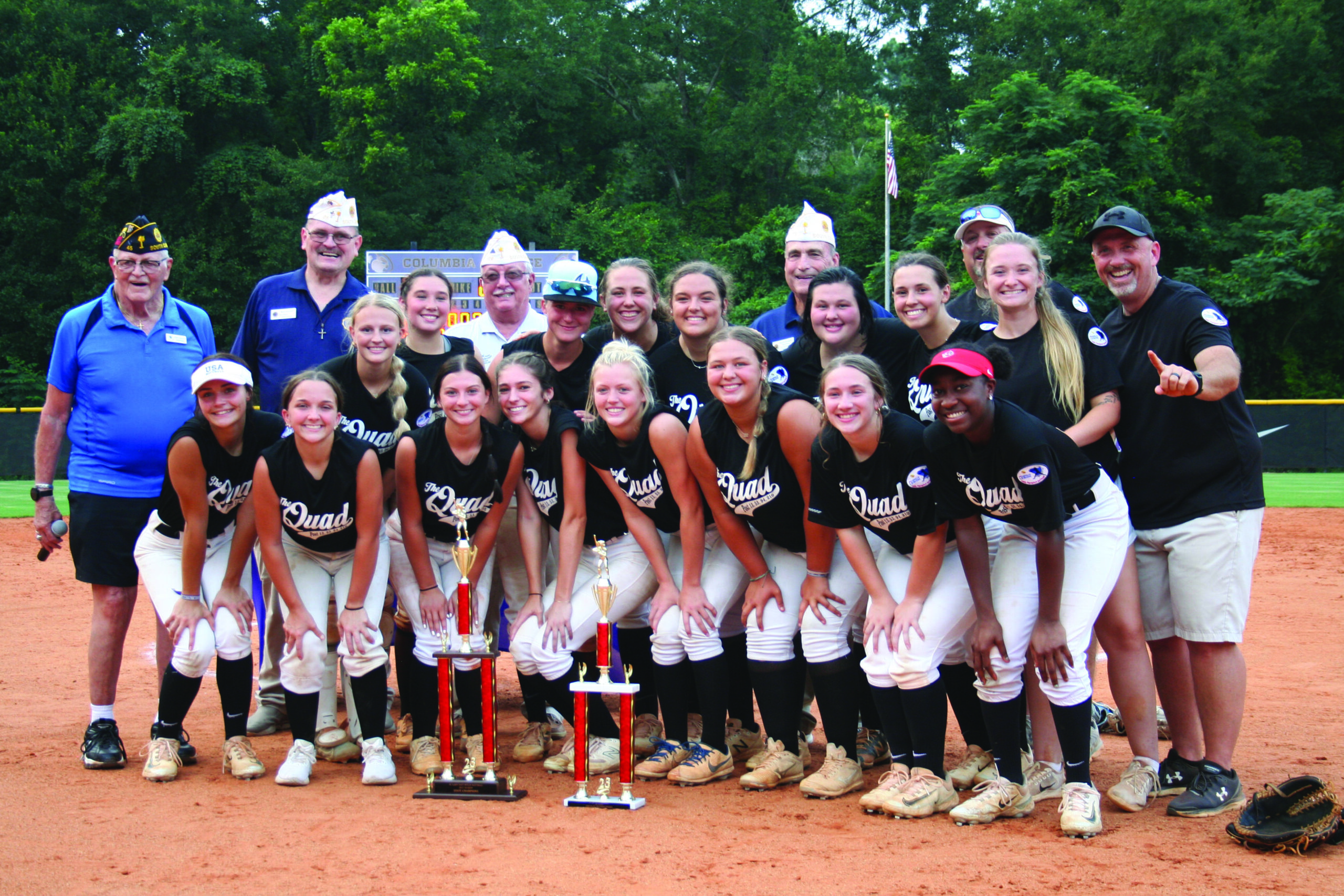 Back– Chairman ALSC SC Lady Fastpitch Softball Bob Scherer, 4th Vice Commander Russ Cantrell, Ashton Goodwin, Alyssa Poston, Department Commander Jim Kvan, Olivia Martin, Cayton Thompson, Ramzee Williams, 1st Vice Commander Bruce Donegan, Dakota Melancone, Averie Easters, Coach Chris Weaver, Coach Madie Andrews and Coach Lee Andrews. PHOTO BY PHYLLIS CAPLES